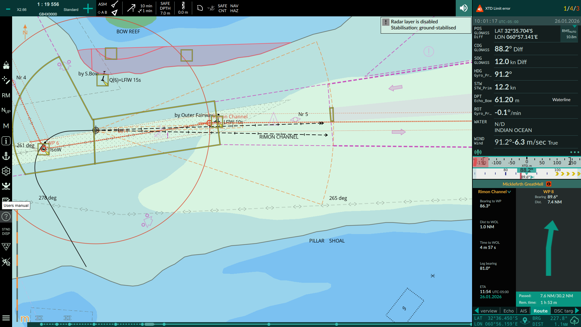 - За расчет и отображения текущих параметров рейса относительно плановых значений, выработки сообщений, предупреждений и сигналов тревоги при наступлении условий, предусмотренных стандартами для ЭКНИС;