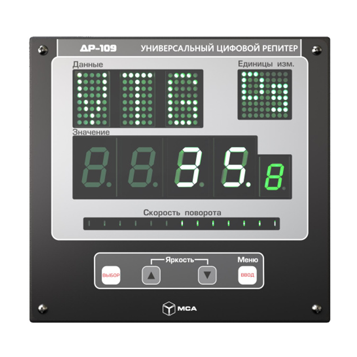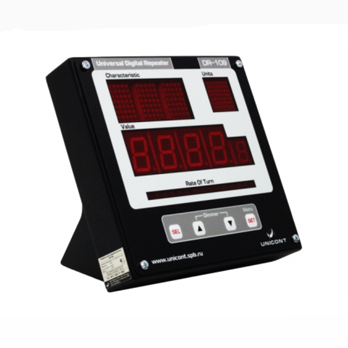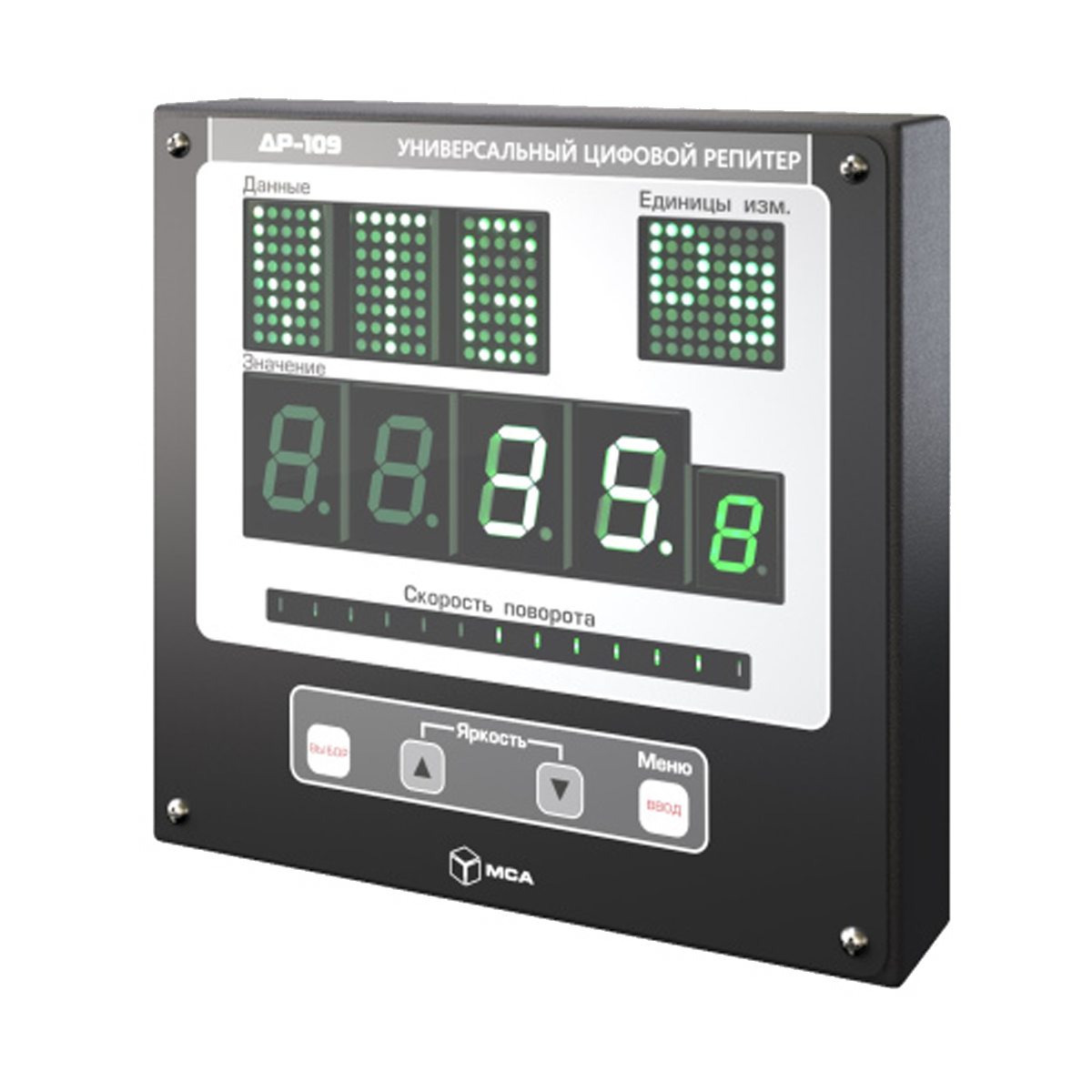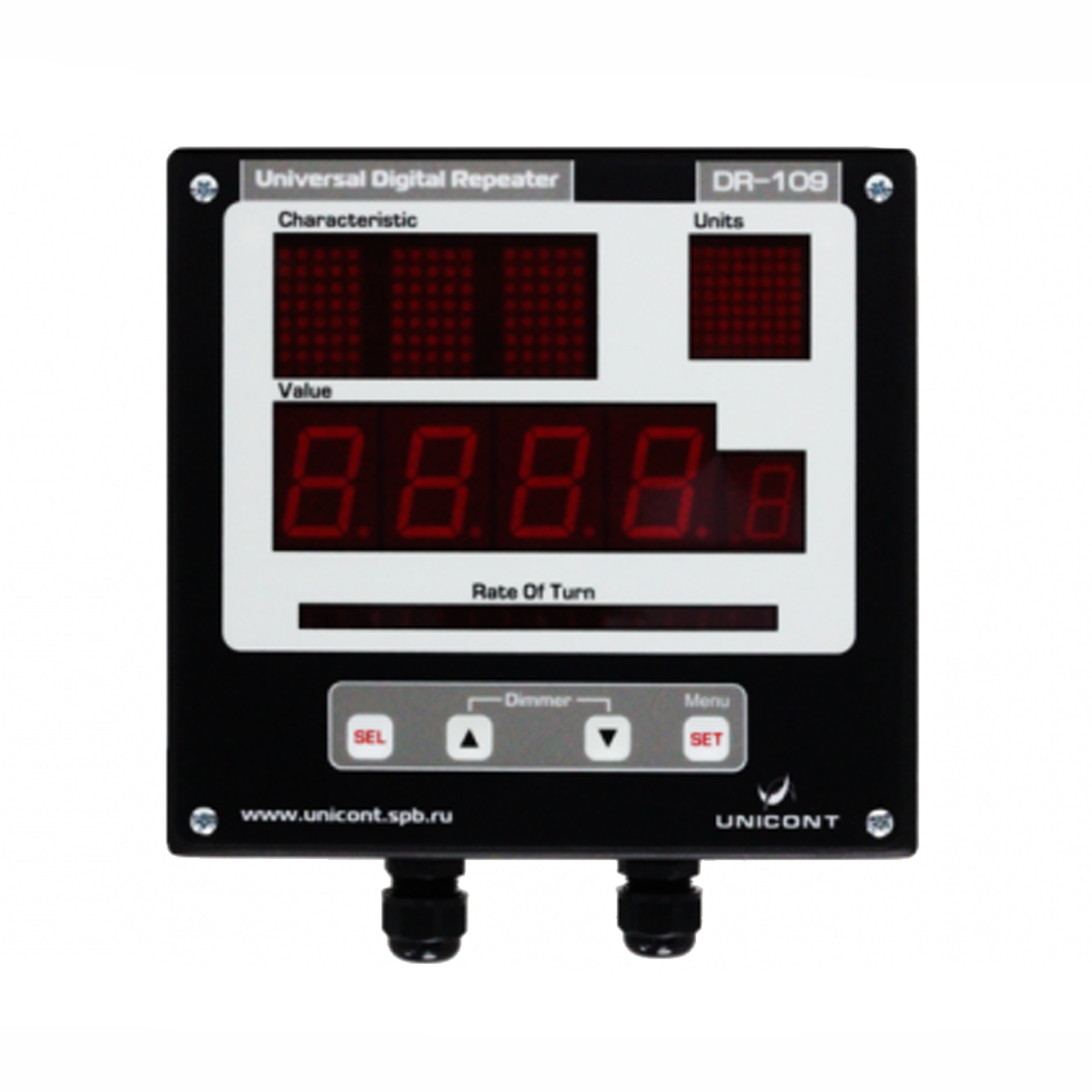 Универсальный цифровой репитер ДР-109 – это устройство, предназначенное для визуальной индикации цифровых данных. Данные получаются по стандарту NMEA 0183 через последовательные интерфейсы RS-232 и RS-422. Репитер обеспечивает последовательное отображение до трех видов данных NMEA на встроенном светодиодном индикаторе. Информация о скорости поворота судна выводится отдельно на светодиодную линейку.