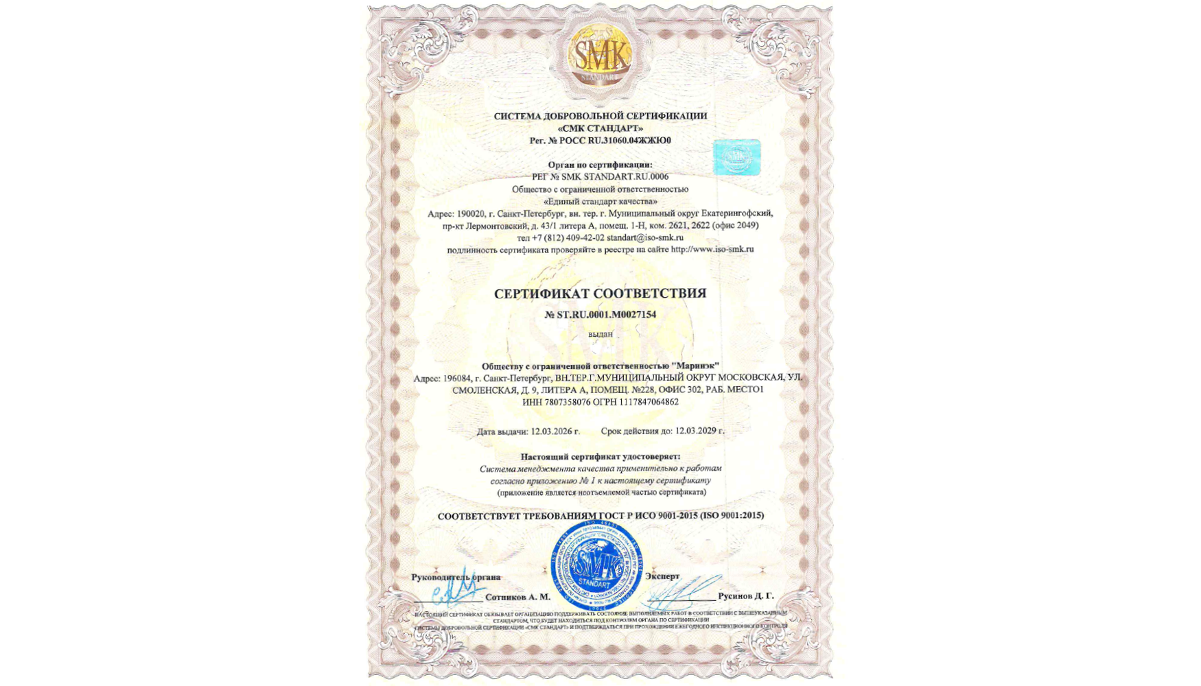 Сертификат ISO 9001:2015 - это признание того, что все бизнес-процессы внутри ГК «Маринэк» выстроены прозрачно, эффективно и нацелены на максимальное удовлетворение потребностей наших клиентов и партнеров. Область сертификации охватывает полный жизненный цикл продукции и услуг, что подчеркивает комплексный подход к развитию компании: