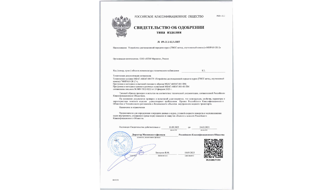 Общество с ограниченной ответственностью «Научно-производственная фирма «Маринэк» (ООО «НПФ-Маринэк»), входящее в состав Группы компаний «Маринэк», достигло нового рубежа в своем развитии. Компания получила Свидетельство об одобрении типа изделия на устройство дистанционной передачи курса (ГНСС метод, спутниковый компас) «МИРАН СК-2». Это означает, что данное изделие прошло все необходимые испытания и проверки, подтвердив свое соответствие установленным требованиям и стандартам.