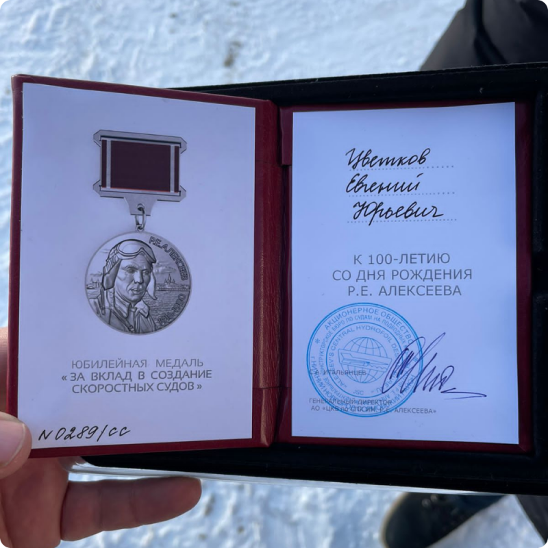 Медаль за вклад в создание скоростных судов от ЦКБ СПК им. Р. Е. Алексеева