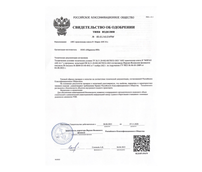 На основании результатов проверок и испытаний, проведенных в соответствии с согласованной Российским Классификационным Обществом документацией, подтверждается соответствие изделия согласованной документации, требованиям Правил Российского Классификационного Общества и Технического регламента о безо пасности объектов внутреннего водного транспорта.