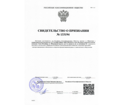 - Наличие сертификатов РКО, РМРС, СТИС МВД, СТ-1 Минпромторга. Также имеются сертификаты на собственное ПО для судового оборудования.