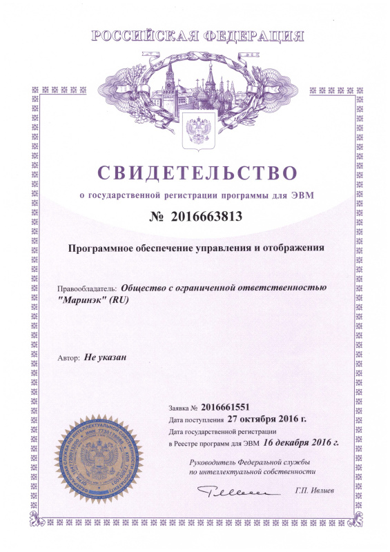 Патент (свидетельство о государственной регистрации ПО для ЭВМ) Программное обеспечение управления и отображения