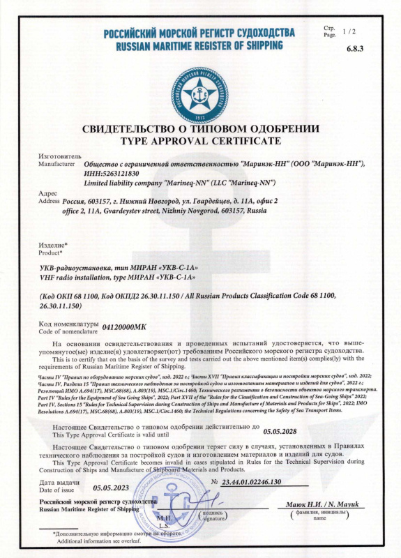 СВИДЕТЕЛЬСТВО О ТИПОВОМ ОДОБРЕНИИ РОССИЙСКОГО МОРСКОГО РЕГИСТРА СУДОХОДСТВА
