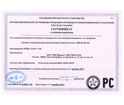 Добровольный сертификат о типовом одобрении РМРС МР-Н2