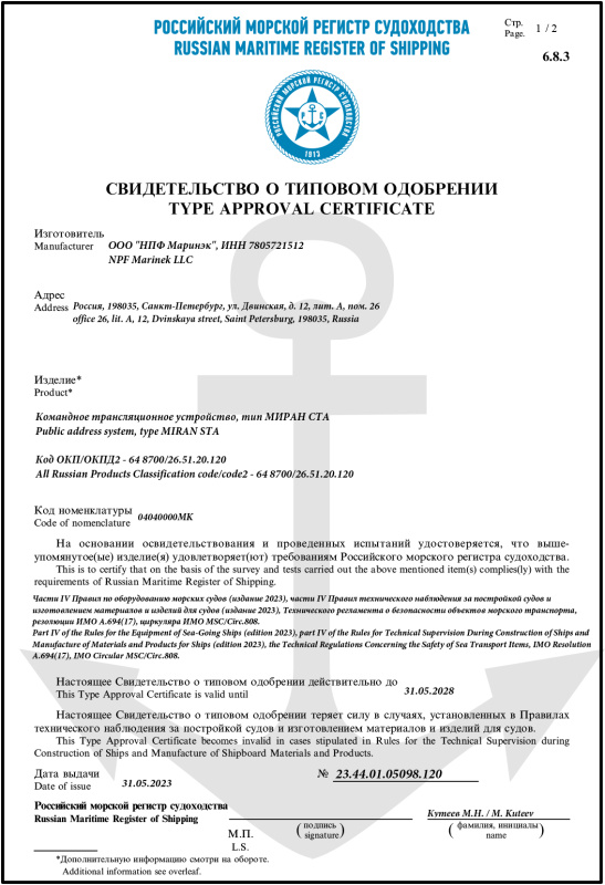 Свидетельство о типовом одобрении РМРС МИРАН СТА