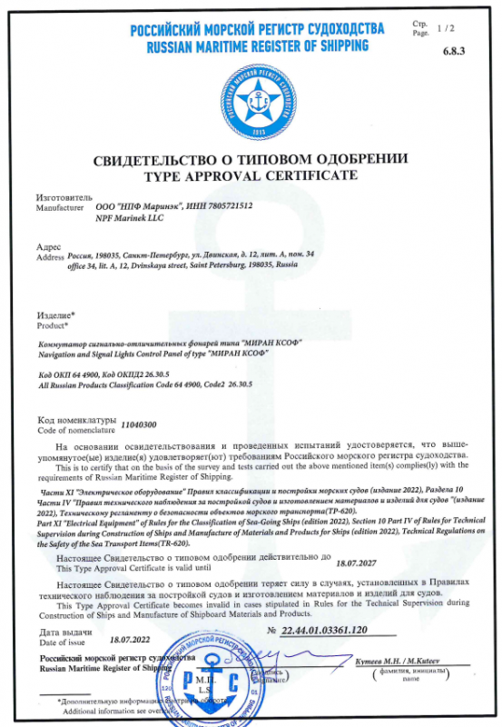 РМРС Свидетельство об типовом одобрении КСОФ МИРАН