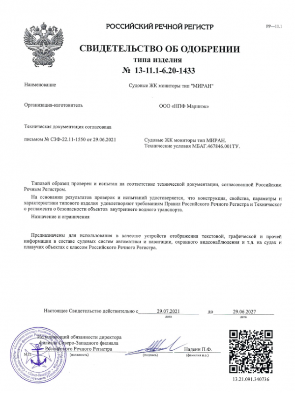 Свидетельство об одобрении РКО Судовые ЖК мониторы