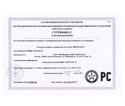 Сертификат о типовом одобрении РМРС СКУД МИРАН-СК21