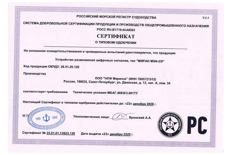 Сертификат о типовом одобрении РМРС МИРАН MSN-28