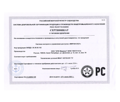 Сертификат о типовом одобрении СКУД МИРАН СК-21