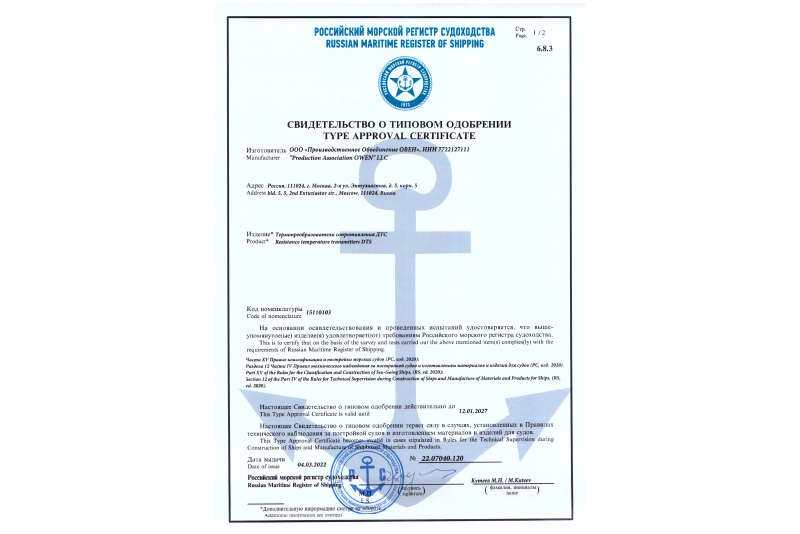 Сертификат РМРС на Контроллеры судовые универсальные