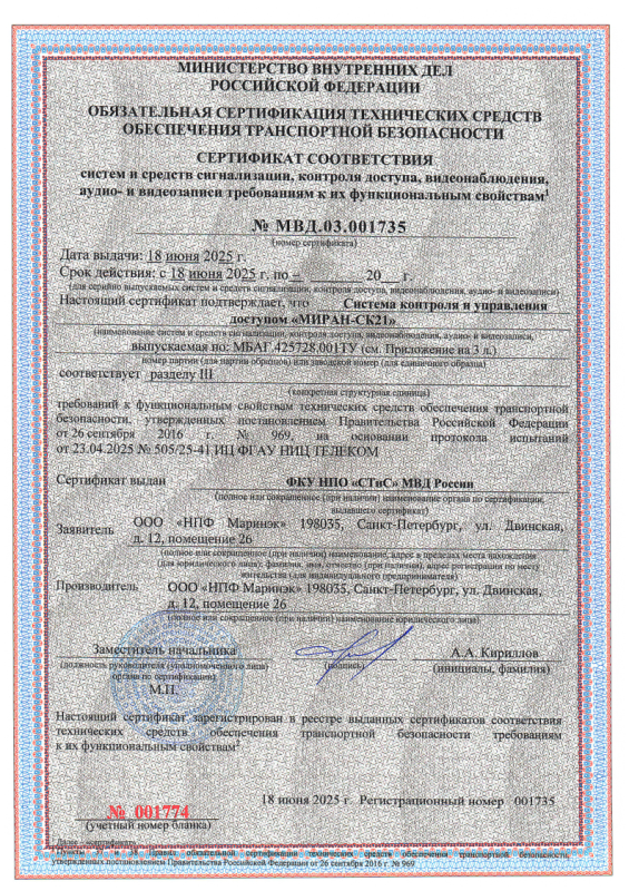 Сертификат соответствия СТиС МВД РФ СКУД МИРАН СК-21