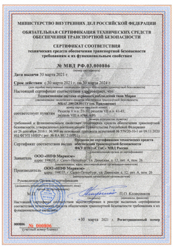 Сертификат соответствия СТиС МВД РФ ТСОН МИРАН