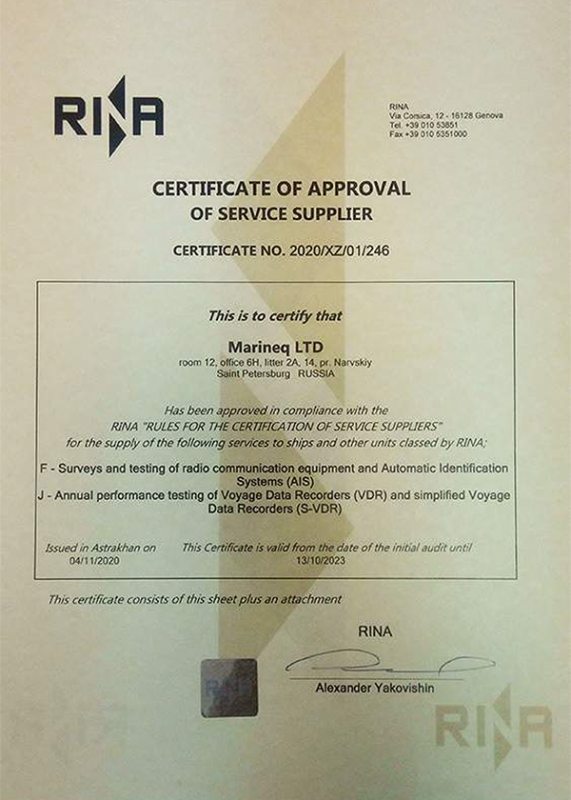 RINA Certificate of Approval of Service Supplier Marineq LTD