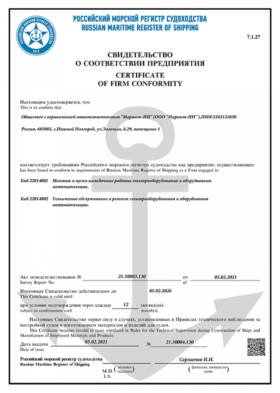 РМРС Свидетельство о соответствии предприятия ООО Маринэк-НН