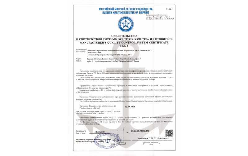 Свидетельство о соотвествии СКК 1 для ООО "Маринэк-НН"