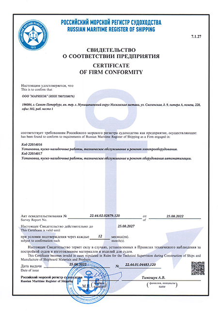 —Свидетельство РМРС о соответствии предприятия ООО "Маринэк"