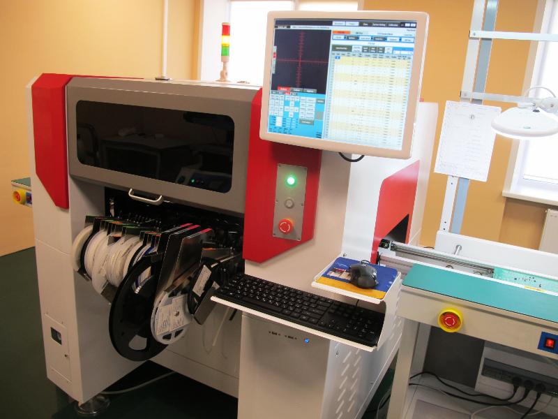 Установщик SMD представляет собой высокоскоростной установщик компонентов с четырьмя монтажными головками и 64 питателями. Шаг вывода составляет 0,3 мм, максимальная высота компонентов – 20 мм.