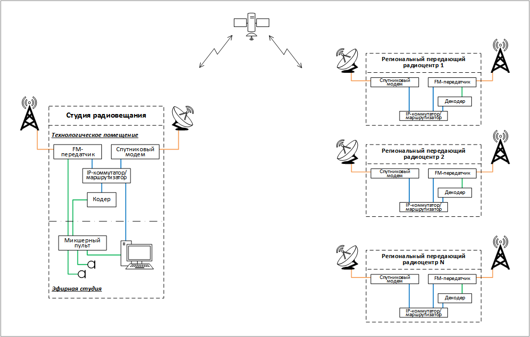 Сеть радиовещания в FM-диапазоне через спутниковый канал связи.
